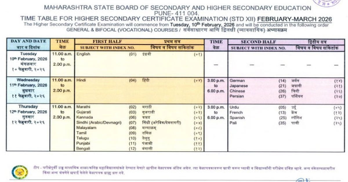 مہاراشٹر بورڈ امتحان 2026 : مہاراشٹر اسٹیٹ بورڈ آف سیکنڈری اینڈ ہائر سیکنڈری ایجوکیشن نے کلاس 10 ویں اور کلاس 12 ویں کے طلباء کے لیے مہاراشٹر بورڈ امتحان 2026 کا شیڈول جاری کیا ہے۔ تفصیلی شیڈول بورڈ کی آفیشل ویب سائٹ مہاایس ایس سیبورڈ.میں پر دستیاب ہے۔ جاری کردہ شیڈول کے مطابق، ایچ ایس سی یا کلاس 12 کے امتحانات 10 فروری 2026 کو شروع ہوں گے اور 11 مارچ 2026 کو ختم ہوں گے۔ امتحان دو شفٹوں میں لیا جائے گا: صبح کی شفٹ 11 بجے سے دوپہر 2 بجے تک، اور دوپہر کی شفٹ 3 بجے سے شام 6 بجے تک ہوگی۔ ایس ایس سی (کلاس 10) کے طلباء کے لیے، امتحانات 20 فروری، 2026 کو شروع ہونے والے ہیں، اور 18 مارچ، 2026 کو ختم ہونے والے ہیں۔ یہ پرچے دو شفٹوں میں منعقد کیے جائیں گے، جن میں موضوع کے لحاظ سے صبح 11 بجے سے 2 بجے اور دوپہر 3 بجے سے شام 6 بجے تک شامل ہیں۔ پچھلے سالوں کی طرح، مہاراشٹر بورڈ امتحان 2026 ریاست کے تمام نامزد امتحانی مراکز میں آف لائن (قلم اور کاغذ) موڈ میں منعقد کیا جائے گا۔ اگلے سال بورڈ کے امتحانات میں شرکت کرنے والے طلباء ایس ایس سی اور ایچ ایس سی امتحانات کے لیے مکمل مضمون وار ٹائم ٹیبل چیک کر سکتے ہیں اور مہاایس ایس سیبورڈ.میں پر جا کر اس کے مطابق تیاری شروع کر سکتے ہیں۔